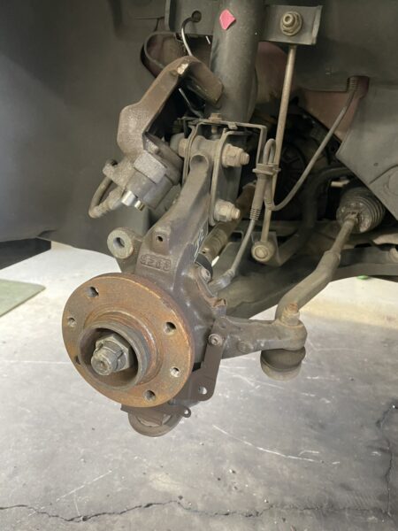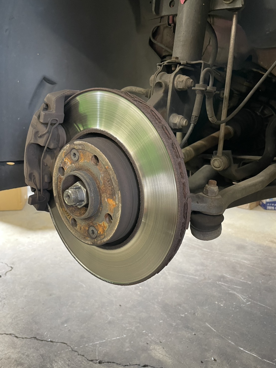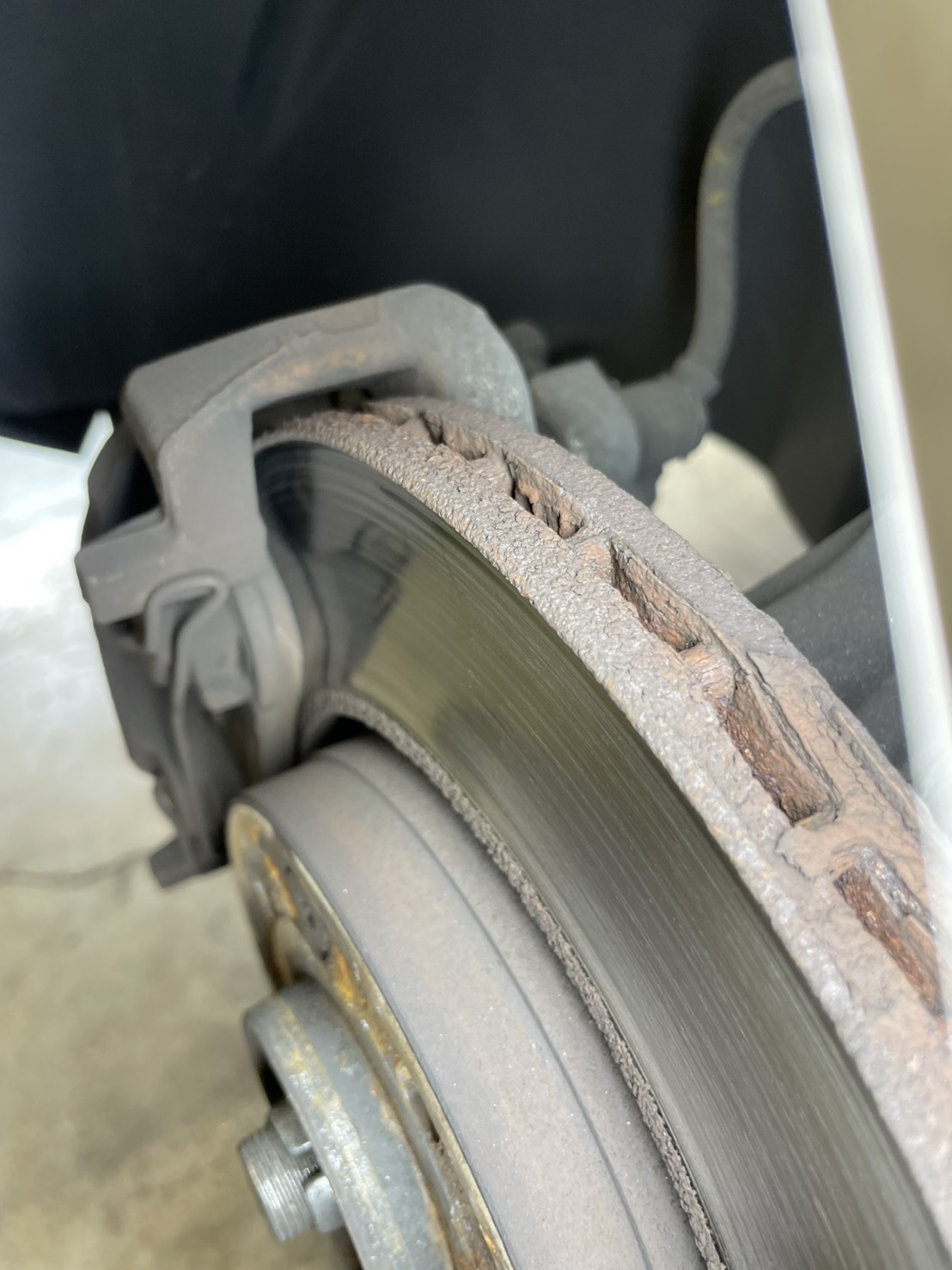 摩耗が進んでいたブレーキパッドとローターをセットで交換。ブレーキダストを清掃し、各部のグリスアップを行いながら組み上げることで、鳴きの防止と本来の制動力を確保します。