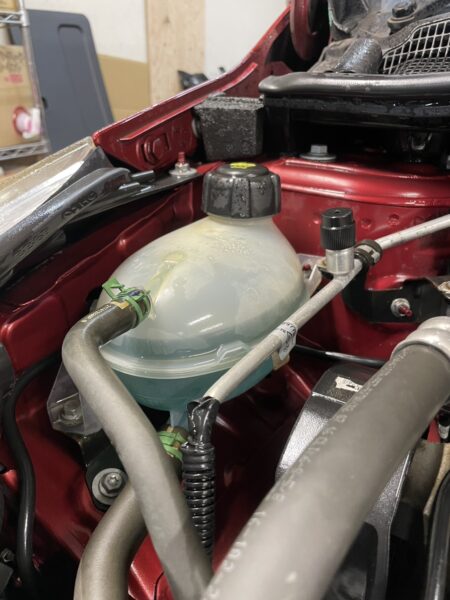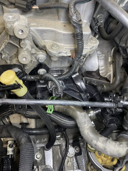 オーバーヒートを未然に防ぐため、サーモスタットを新品へ交換。樹脂パーツの劣化具合も確認しながら、慎重に作業を進めます。交換後は冷却水を補充し、エア抜きを徹底して冷却機能を正常化させます。