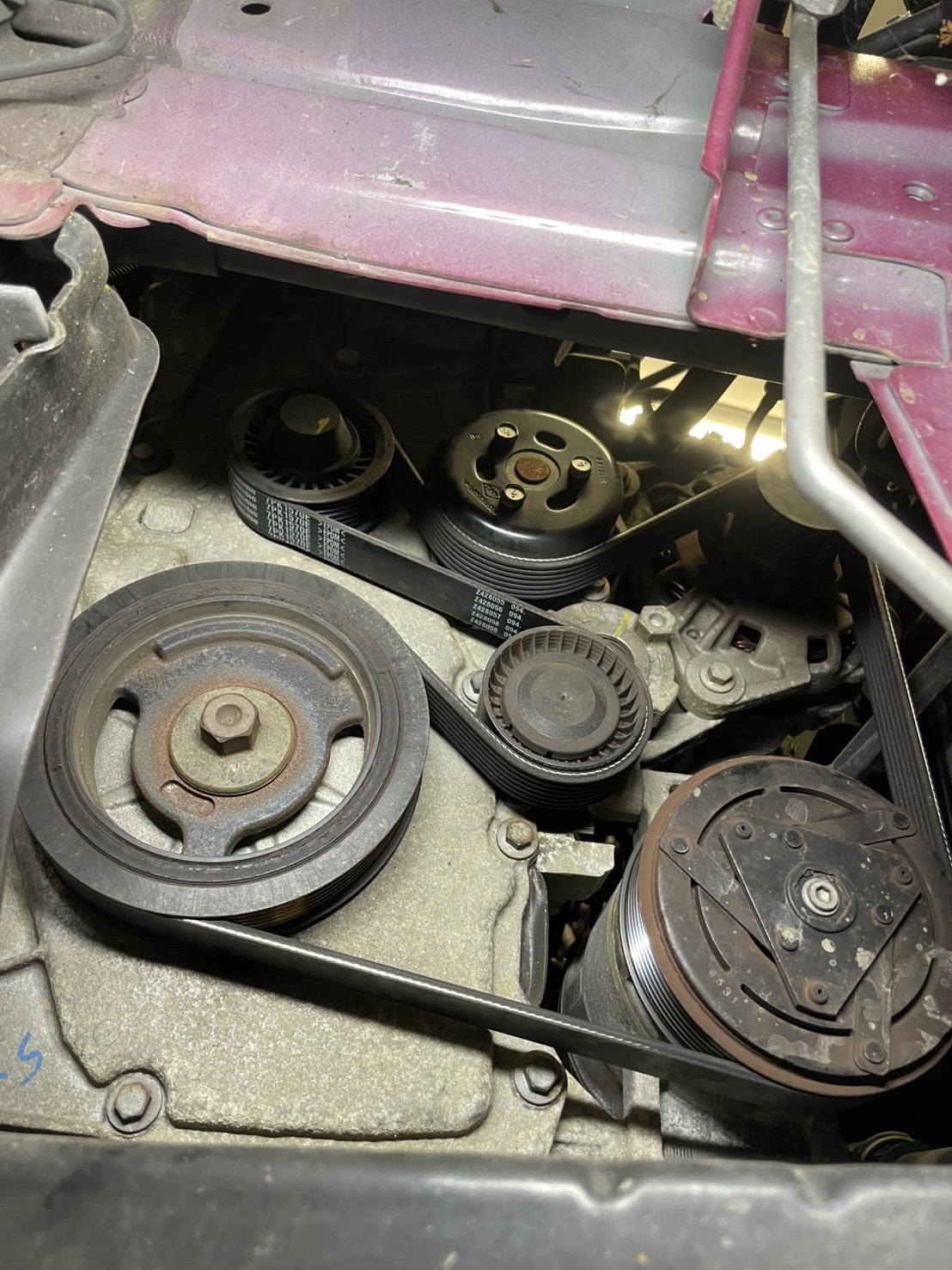 走行中の異音や、最悪の事態であるベルト切れを防ぐため、プーリーベルトを新品へ交換。ベルトを支えるプーリー側のベアリングにガタが出ていないかも入念に確認し、スムーズな回転を取り戻します。